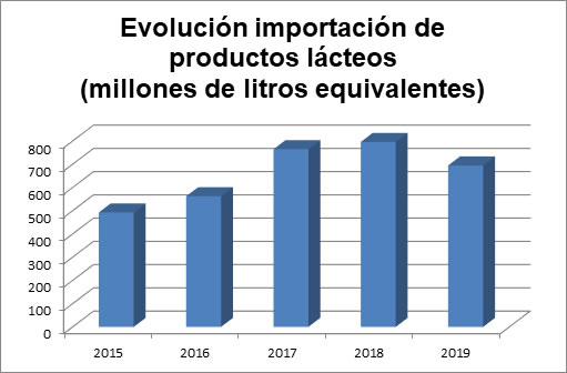 De igual modo, las importaciones de leche evaporada subieron un 38% en 2019, de 6,9 millones de litros equivalentes a 9,5 millones de litros equivalentes, es decir, un incremento de 2,6 millones de litros equivalentes entre 2018 y 2019.