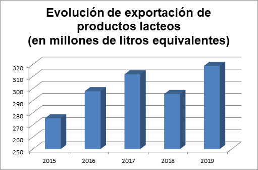 De acuerdo a datos de Odepa, las exportaciones de productos lácteos crecieron un 7,9% entre enero y diciembre de 2019, sumando 318,6 millones de litros equivalentes en el periodo, 23,2 millones de litros equivalentes más que en 2018.