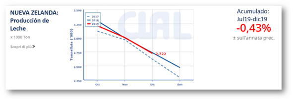 En Nueva Zelanda, la producción de leche en diciembre de 2019 disminuyó un 0,5% en comparación con diciembre de 2018. En la temporada de producción de junio a diciembre, hubo una disminución del 0,43% en comparación con el mismo período del año pasado. Sin embargo, la producción estacional en sólidos lácteos es de + 0,4% en comparación con junio-diciembre de 2018.