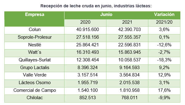 Según los datos ofrecidos por Odepa, la recepción de leche cruda de la industria láctea mayor en junio de 2021 se redujo en un 2,2% en comparación con igual mes del año pasado, con una baja interanual de 3,0 millones de litros, alcanzando hasta 135,7 millones en total, siendo además el tercer mes dentro de 2021 con resultado negativo.