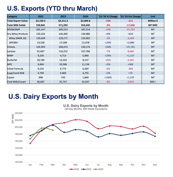 Después de un sólido desempeño interanual (YOY) en febrero, las exportaciones de lácteos de EE. UU. volvieron a caer en números rojos en términos de equivalente de sólidos lácteos (MSE) en marzo. El volumen interanual de MSE cayó un 7% a pesar del aumento de las ventas de queso en EE. UU. y las ganancias en suero rico en proteínas, concentrado de proteína de leche y permeado de suero.