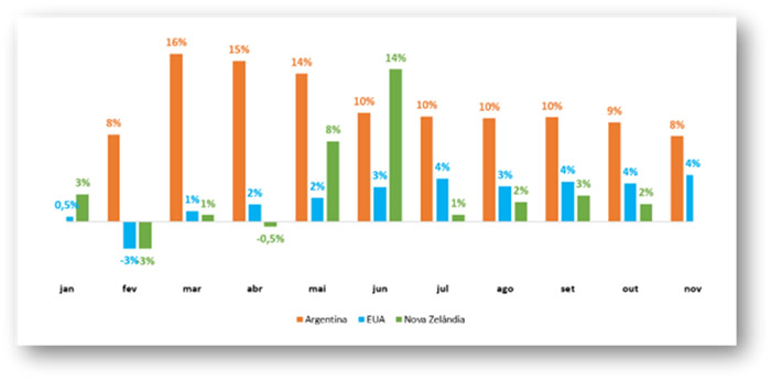 Diferentes centros de producción aumentan la oferta a lo largo del año, como se observa en la variación de la producción en algunos países en comparación con el mismo período de 2024 (Gráfico 1), lo que resultó en una mayor disponibilidad de leche y productos lácteos. Además, la demanda de productos lácteos varió: en algunos países se observa estabilidad, en otros una ligera disminución o incluso un ligero aumento. Este movimiento estructural se puede observar claramente en los principales indicadores de precios del mercado internacional.