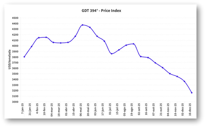 El Global Dairy Trade (GDT), referente para la fijación de precios en el comercio mundial de lácteos, reflejó a lo largo del año la dificultad de mantener los precios en un entorno de alta oferta. Las caídas observadas en los precios de los productos lácteos a lo largo de 2025 indican que el ajuste necesario para permitir el flujo del volumen adicional se produce principalmente a través de los precios. Si bien hubo fluctuaciones ocasionales entre subastas, el comportamiento general indicó un mercado bajo presión, con los precios de los principales derivados encontrando resistencia a mantenerse en niveles altos, como se puede observar en el Gráfico 3, que ilustra los movimientos de la leche en polvo entera (LPE), el principal producto comercializado, en referencia a la última subasta realizada.