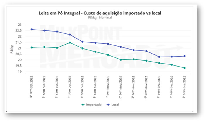 Gráfico 5 . Precios nominales de la leche entera en polvo (R$/Kg) - Costo de adquisición importado vs. local