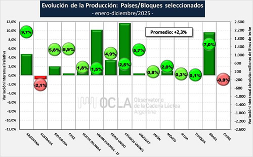 El Observatorio de la Cadena Láctea Argentina (OCLA) publicó datos que consideran a un grupo seleccionado de los principales países que representan algo más del 55% de la producción mundial de leche de vaca, en el cual se puede observar un alza de la producción del 2,2%, para el año 2025 respecto al año 2024.