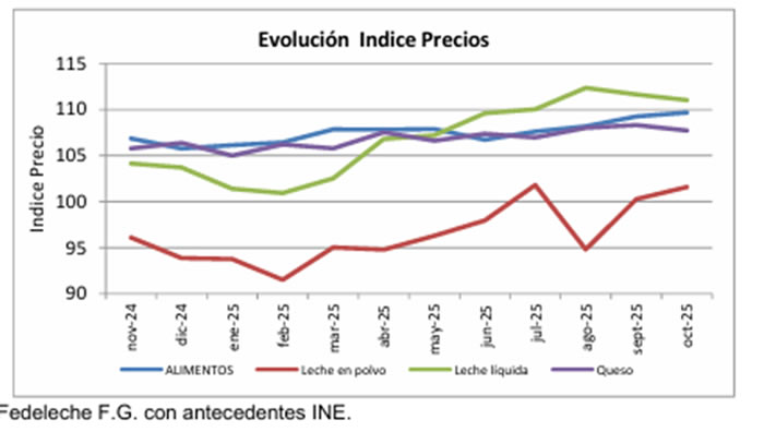 En el desglose por producto, la variación mensual de los postres lácteos lideró las alzas, con un aumento de 2,0% (8,8% anual y 10,7% a 12 meses), mientras la leche en polvo hizo lo propio con un 1,3% (+8,2% y +5,4%).