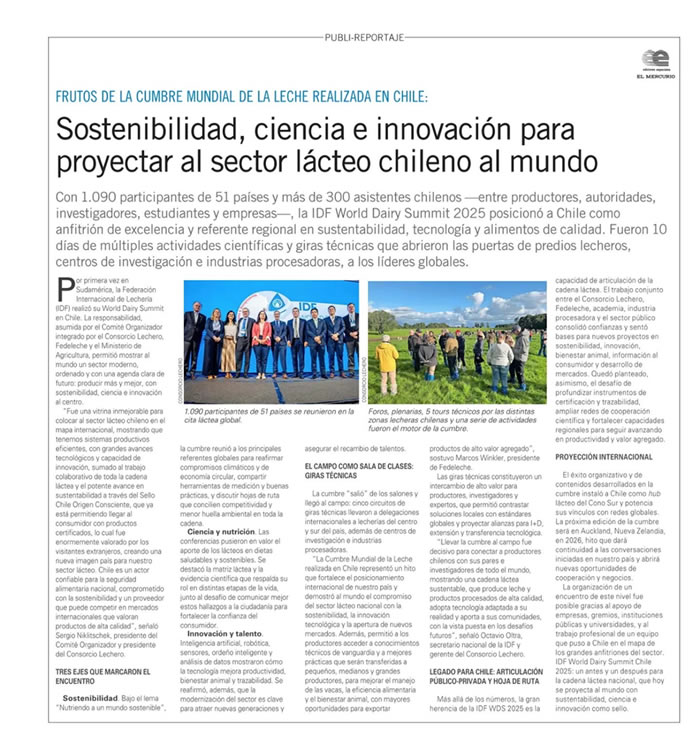 Por primera vez en Sudamérica, la Federación Internacional de Lechería (IDF) realizó su World Dairy Summit en Chile. La responsabilidad, asumida por el Comité Organizador integrado por el Consorcio Lechero, Fedeleche y el Ministerio de Agricultura, permitió mostrar al mundo un sector moderno, ordenado y con una agenda clara de futuro: producir más y mejor, con sostenibilidad, ciencia e innovación al centro.
