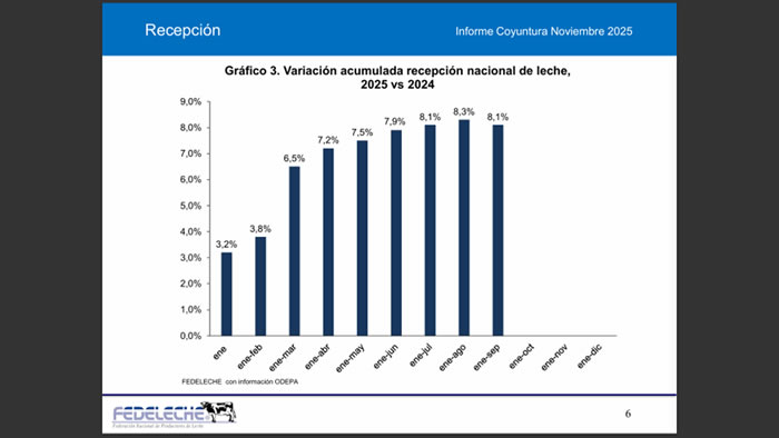 En este periodo, la recepción de leche cruda registró a nivel nacional un incremento del 8,1% en relación con el mismo periodo de 2024, alcanzando un total de 1.618,1 millones de litros, logrando un avance interanual de 121,1 millones de litros.