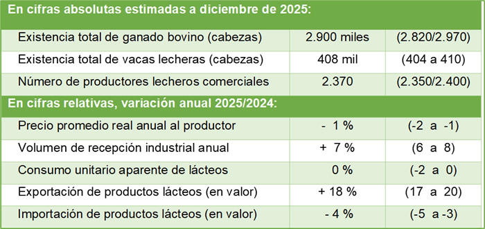En relación con la existencia bovina nacional, el Observatorio proyecta que a diciembre de 2025 el país contará con 2,9 millones de cabezas de ganado bovino y alrededor de 408 mil vacas lecheras, reflejando un repunte asociado a mejores precios, mayor retención y al crecimiento de los planteles de grandes lecherías. Asimismo, los resultados evidencian que la producción por lactancia se aproxima a los 6.000 litros por vaca, de acuerdo con las cifras del Control Lechero Oficial, lo que confirma avances significativos en eficiencia productiva