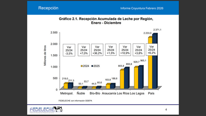 La recepción de leche cruda en Bio-Bio registra un incremento de 36,2% comparado con el mismo periodo del año anterior, aumentando de 44,5 a 60,6 millones de litros, lo que supone 16,1 millones de litros adicionales respecto de 2024. Con ello, la participación se mantiene en 2,6% a nivel nacional.