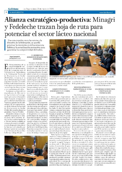 El fortalecimiento de la competitividad del sector lácteo chileno marcó el eje de la reunión entre el Ministerio de Agricultura y la Federación Nacional de Productores de Leche (Fedeleche), instancia en la que se definió una hoja de ruta conjunta enfocada en inversión hídrica, modernización normativa y apoyo a productores, con miras a impulsar el crecimiento y las exportaciones del rubro.