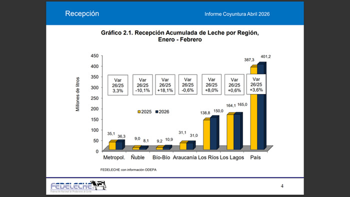 En cuanto a la evolución regional, la recepción de leche en la región de Los Lagos registró una variación de 0,9% respecto de 2025, al pasar de 164,1 a 165,0 millones de litros. Este resultado representa un alza interanual de 947 mil litros y consolida su participación del 41,1% dentro del total nacional.
